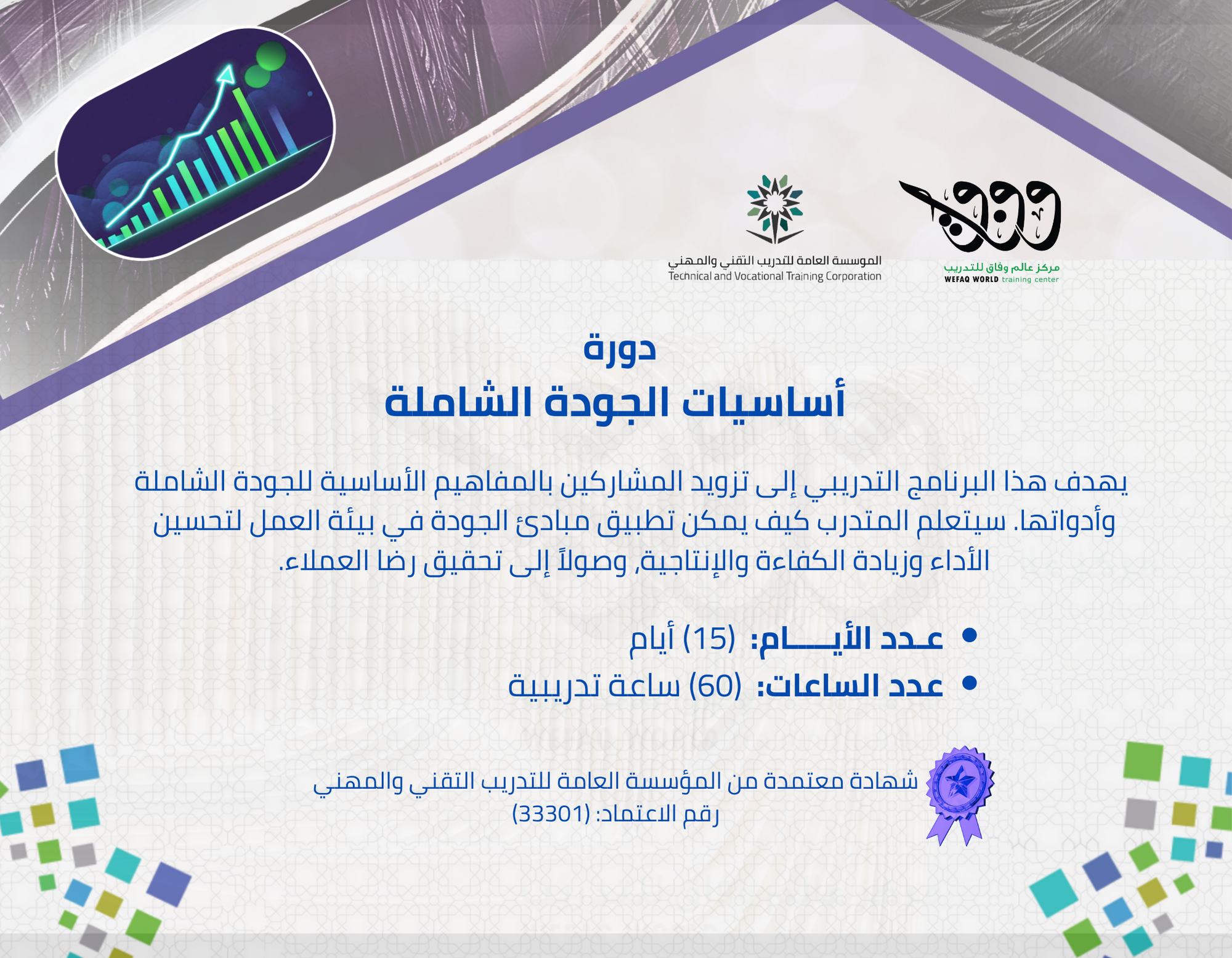 يهدف هذا البرنامج التدريبي إلى تزويد المشاركين بالمفاهيم الأساسية للجودة الشاملة وأدواتها. سيتعل