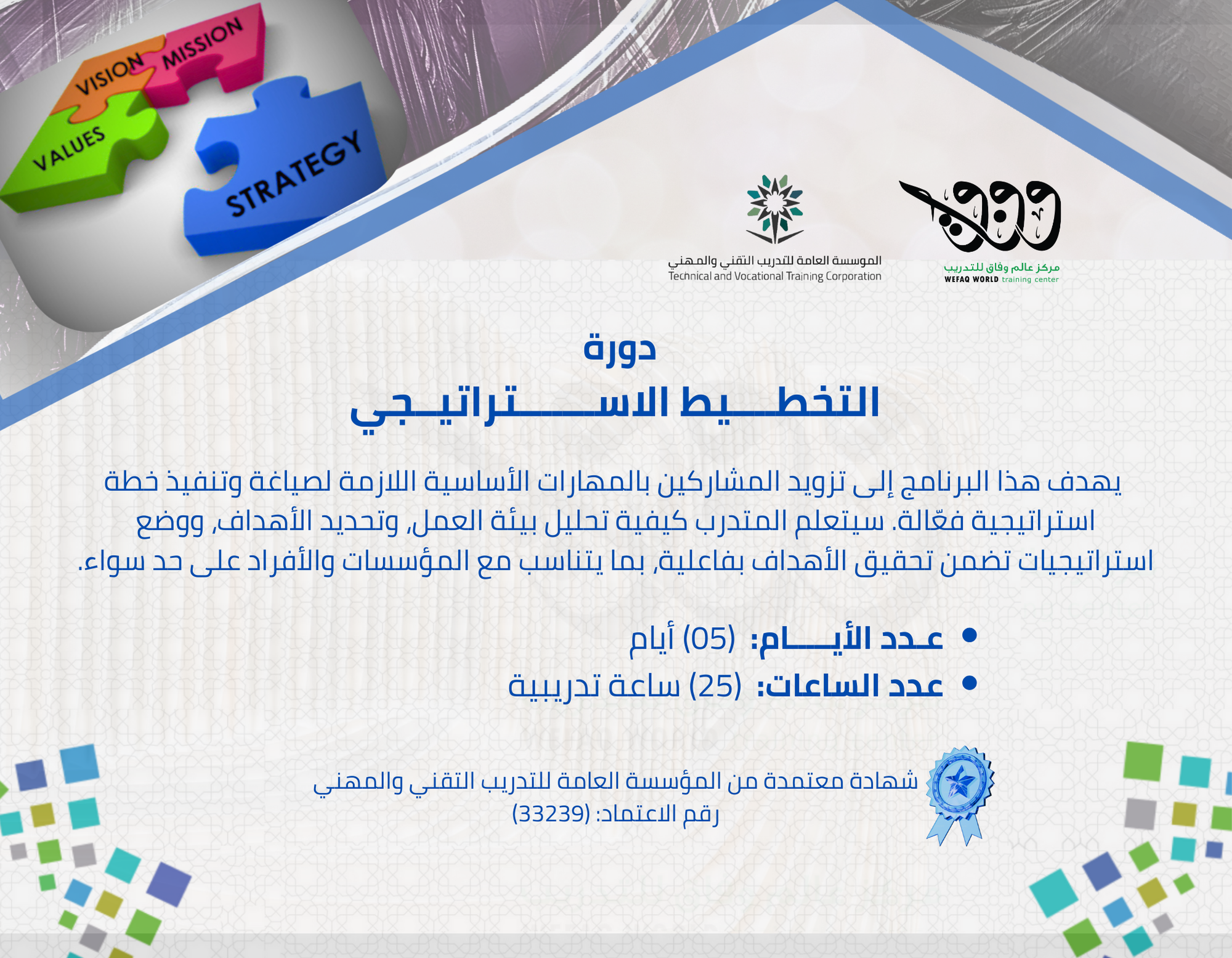 يهدف هذا البرنامج إلى تزويد المشاركين بالمهارات الأساسية اللازمة لصياغة وتنفيذ خطة استراتيجية فع